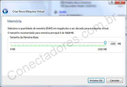 Na próxima tela escolha o tamanho da memoria RAM que será reservada para a VM, lembre-se que depende do seu computador, já que ele tem que suportar a máquina real e a virtual (ou as virtuais).