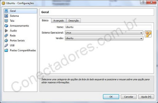 Agora vamos ajustar alguns detalhes, é extremamente recomendável ter conhecimentos de hardware para alterar essas opções, na tela principal selecione a VM e clique em Configurações, na janela que vai abrir você terá as opções abaixo.