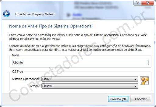 Para começar clique no Botão Novo na parte superior esquerda, será apresentada uma tela de boas vindas, e em seguida a tela abaixo, escolha o nome (serve somente para você identificar a VM) o tipo de sistema e a versão, vou simular a instalação de uma VM para o sistema Ubuntu.