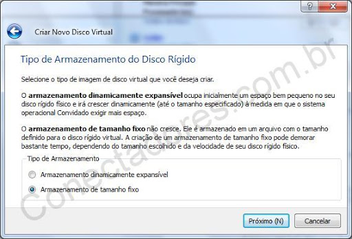 Nessa simulação vou criar um novo para mostrar o processo, na tela abaixo escolha entre armazenamento expansível ou fixo.