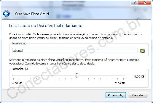 Agora escolha o nome do arquivo vdi e o tamanho, tenha em mente que o tamanho tem que suportar o sistema que será instalado, da mesma forma que um computador real.