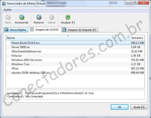 É possível também adicionar imagens ISO para usar na VM, e por fim imagens de disquetes (arquivos img).