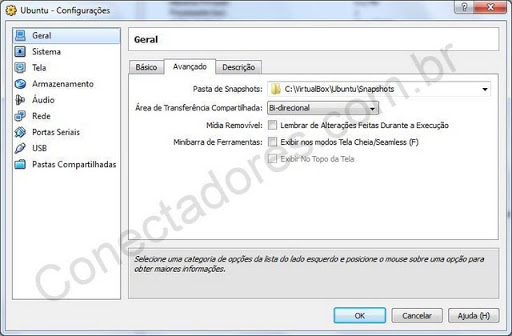Em Avançado você escolha a pasta de snapshots (explico adiante), se a área de transferência (por exemplo quando você copia um texto) é bi-direcional (ambos os lados), do hospedeiro para o convidado, do convidado para o hospedeiro ou nenhum, se a barra de ferramentas é mostrada nos modos Seamless e tela cheia (requerem adicionais para convidado) e a posição da barra.