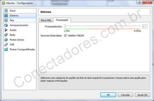 Em Processador é possível escolher quantos processadores serão usados na VM (processadores não é igual nucleo, portanto processadores dual, quad, etc não deixam de ser 1), e o recurso PAE (Physical Address Extension, funciona da mesma forma que uma máquina real) e NX bit.