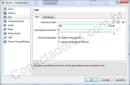 Em vídeo você escolhe o tamanho da memória de vídeo, a quantidade de monitores da VM (somente convidados Windows), se há aceleração 3D (necessário adicionais de convidados, recurso "beta") e aceleração 2D (somente convidados Windows)
