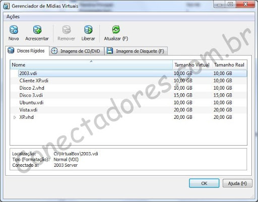 Também é possível gerenciar os discos, imagens de CDs/DVDs (aprenda a criar imagens ISO aqui) e imagens de disquetes na VirtualBox através do menu Arquivo e em seguida escolhendo a opção Gerenciador de Mídias virtuais.